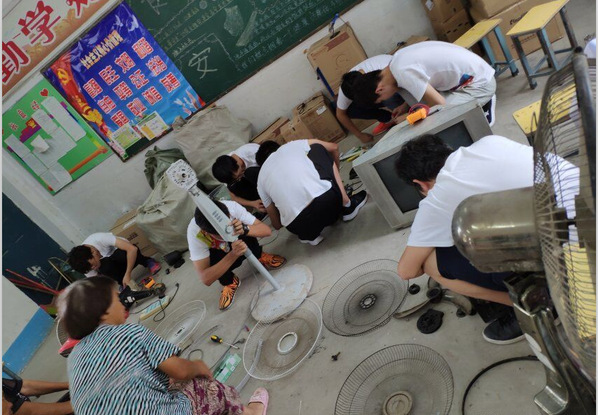 在鸭湖村小学教室里挤满了前来维修小家电的村民,“科技扶贫小分队”开展家电维修及置换服务项目的同学们义务为村民维修家用电器。同时,为了助力脱贫攻坚战略任务的实现,落实好公司关于定点帮扶工作任务安排,根据校团委和公司党委的统一部署安排,在以往家电维修的基础上,增加家电置换项目,这一行动得到了员工企业广东瑞德智能科技股份有限公司的大力支持,重点针对贫困村、贫困户,开展老旧家电免费以旧换新活动,把专业的维修技术与实实在在的关怀帮扶送到基层,深受当地群众的欢迎,村民们纷纷向现场的师生竖起了大拇指。