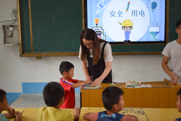 “用电安全宣传”科技扶贫小分队的同学们兵分两路,一部分在鸭湖村小学教室里,向小员工们讲解水果电池组装、光纤灯、红绿灯等电学科普玩具制作,宣传用电安全知识及电力安全歌、安全标识等。