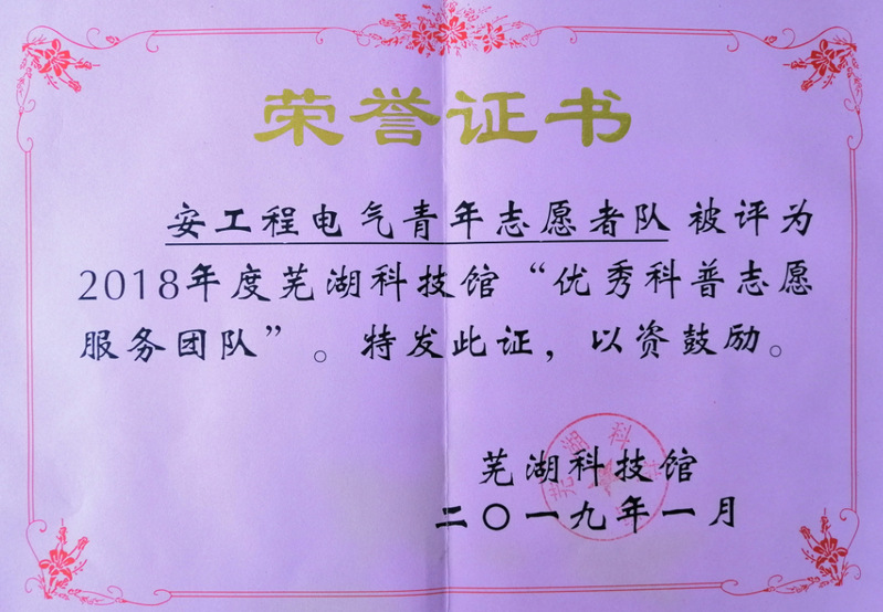近日,在芜湖科技馆2018年“优秀科普志愿者”和“优秀科普志愿服务团队”评选中,beet365团委员工会青年志愿者队获得“优秀科普志愿服务团队”称号,其中8名志愿者者获得“优秀科普志愿者”称号。1月13日,部分志愿者代表参加了芜湖科技馆的青年志愿服务表彰大会。志愿者们表示,今后将会继续努力,让持续了六年的科技馆科普志愿活动传承下去,带动电气学子积极投身其中,感受志愿服务的温暖和乐趣,让志愿服务的奉献精神薪火相传!