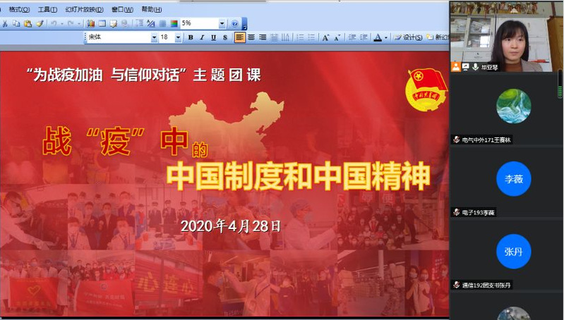 电气研团支部积极响应公司要求,运用网络平台采取线上会议的形式,推进“为战疫加油,与信仰对话”主题团课覆盖到全团支部团员青年。让同学们了解了此次疫情中国的大国担当和显现出的中国力量,让同学们了解到了“疫情”大考后的青年担当。