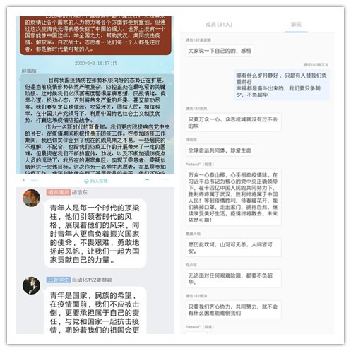 电子171团支部注重群讨论的形式来开展主题团课。作为新时代的青年要坚定必胜的信念,持续用力,以“不破楼兰终不还”的拼劲,毫不放松抓好疫情防控工作,为赢得这场战役的全面胜利而顽强拼搏。