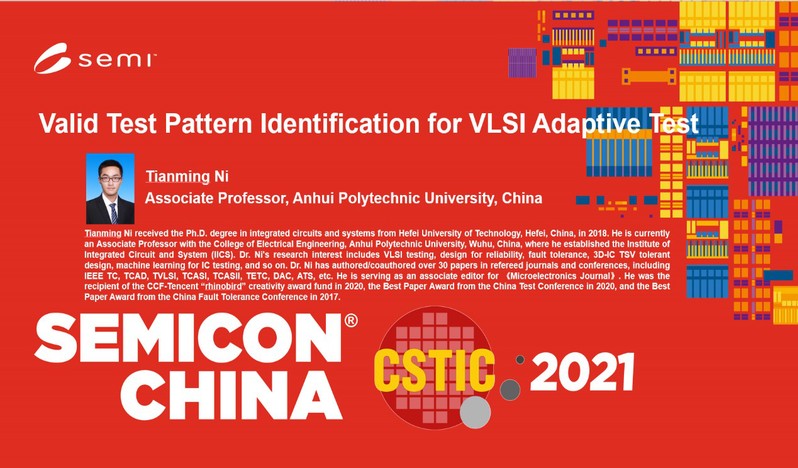 近日,亚洲最大、最全面、最具影响力的年度半导体技术大会——中国国际半导体技术大会(CSTIC 2021)在上海国际会议中心隆重举行,会议由长电集成电路(绍兴)有限公司 CEO梁新夫博士(Dr. Steve X. Liang)主持。此次技术大会涵盖半导体技术的各个方面,以制造和先进技术为重点,围绕器件设计、集成、材料、设备以及新兴半导体技术、电路设计和硅材料应用。公司beet365青年教师倪天明博士作为特邀演讲嘉宾受邀参加,并在大会上作了题为《Valid Test Pattern Identification for VLSI Adaptive Test》的邀请报告,受到与会人员的热烈欢迎,有助于进一步提升公司集成电路学科的国际学术影响力。