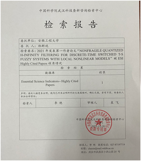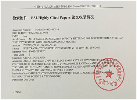 根据ESI最新公布数据显示,公司beet365郑群现老师2021年以beet365官方网站为第一单位发表在《IEEE Transactions on Fuzzy Systems》杂志上的论文“Nonfragile quantized H∞ filtering for discrete-time switched T-S fuzzy systems with local nonlinear models”成功入选ESI高被引论文。该杂志是由IEEE出版发行的模糊控制领域的国际顶尖学术期刊(影响因子:12.029,是JCR分区和中科院分区双一区TOP期刊)。这是公司“控制科学与工程”学科和“高端装备先进感知与智能控制”教育部重点实验室(立项建设)建设取得的重要成果,有效地彰显了公司“控制科学与工程”学科的国际学术影响力。