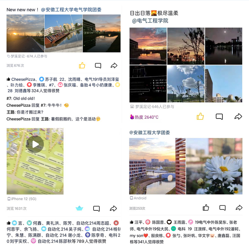 参赛员工需在个人摄影作品前加前缀#梦溪足记#,并将作品发布于QQ、微信和抖音等多个自媒体,再@beet365团委,通过获得的集赞数开展大赛评比。近千人报名参加活动,用千余张不同视角的照片展示不同时辰的校园风光和同学们多姿多彩的第二课堂生活。在员工们发布的摄影、短视频作品中,有感谢相遇,有分享时光;有勾勒“满园春光”,有叙述“晚夏热风”,有记录“秋天晚景”,有绘下“冬日暖阳”;有彼方日光,有现见明月,有夜色灯光,有落日余晖……。据统计,各平台累计集赞数高达10w+,其中QQ空间中#梦溪足记#共有702人参与,浏览量超过1w+;抖音中#梦溪足记#标签共1.2w+播放量。