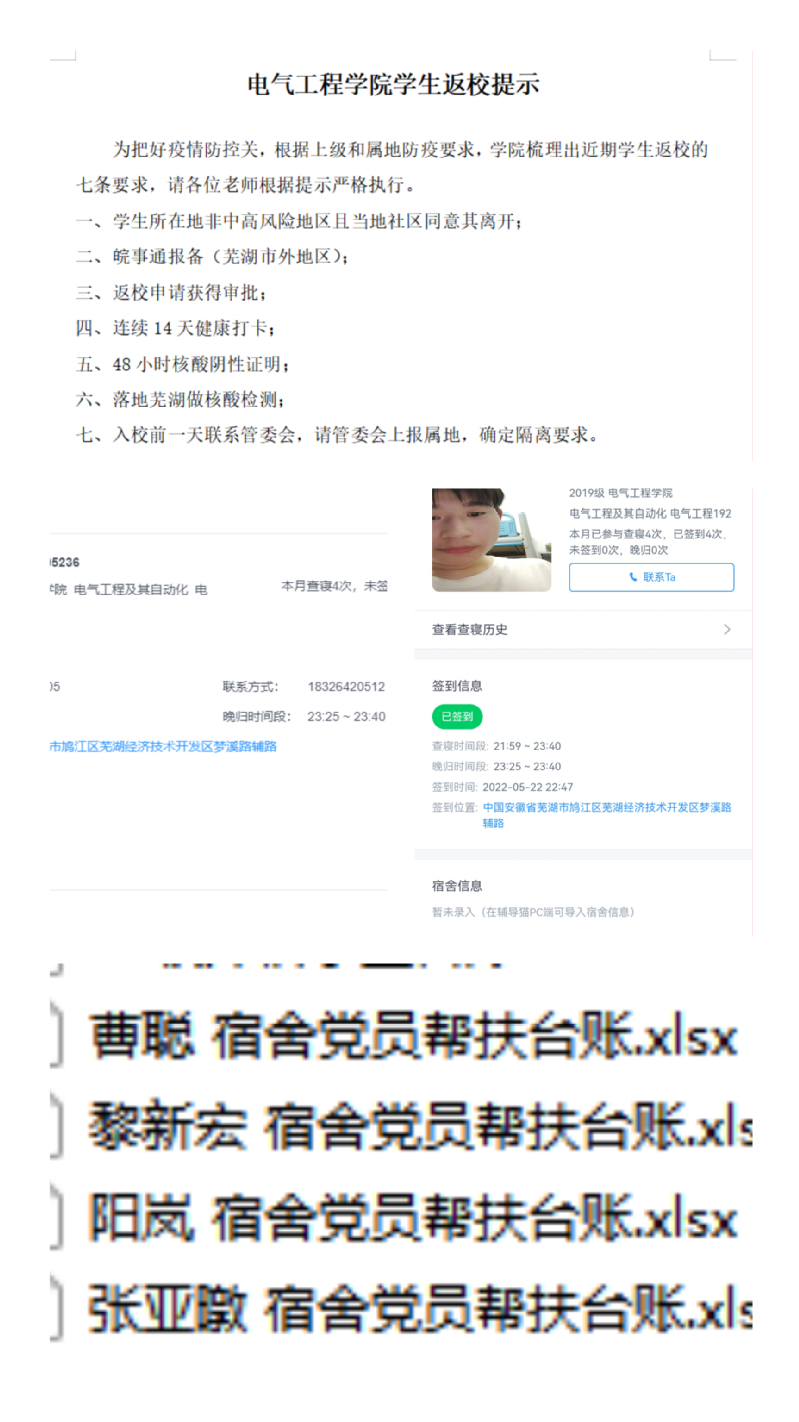 当好“安全员”,筑牢防疫关口。设置四道防护网,全方位守好疫情防控关口。建立党员联系制,要求员工党员在疫情防控中要做到“所在宿舍不出问题,联系宿舍不出问题、联系对象不出问题”,充分发挥党员先锋模范作用;借助“今日校园”app,开展“云”上查寝,实现线上线下查寝相结合,及时准确掌握员工行程动态;在员工工作信息化上下功夫,通过“久待宿舍”、“未回宿舍”大数据比对筛查私自外宿、外出员工;根据公司和属地疫情防控要求,制定员工返校7条要求,并督促辅导员与管委会相关老师协调配合,严把返校入口关。