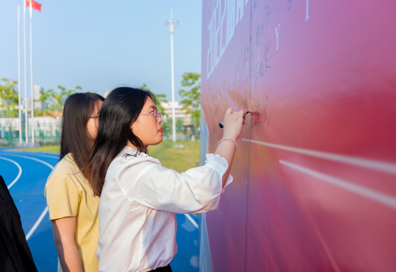 毕业典礼结束后,毕业生在毕业留言墙上签名、拍照留恋。