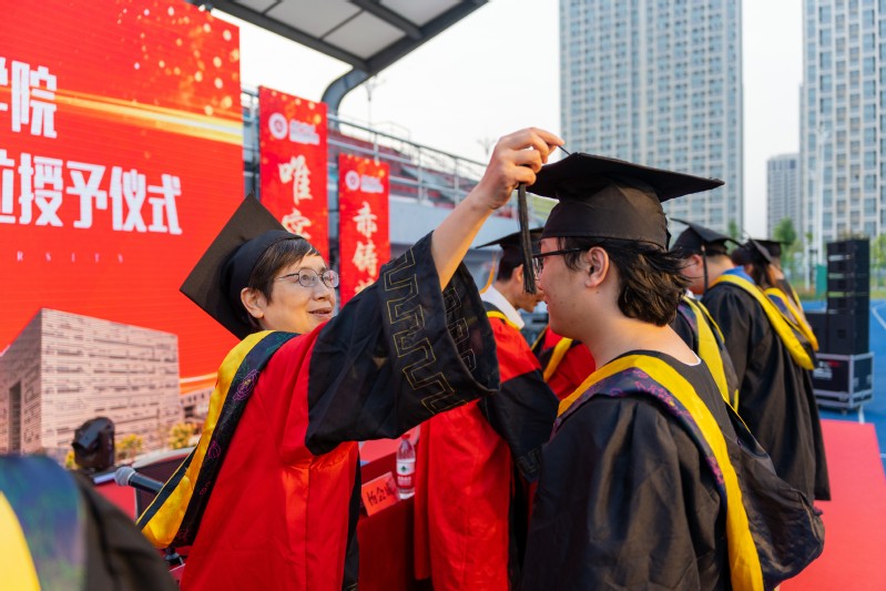 典礼上,全体2022届本科毕业生迎来最具仪式感的时刻——现场嘉宾、教师代表为毕业生扶正流苏。帽穗从右边拨到左边,见证着学子们的成熟、成长、成才。