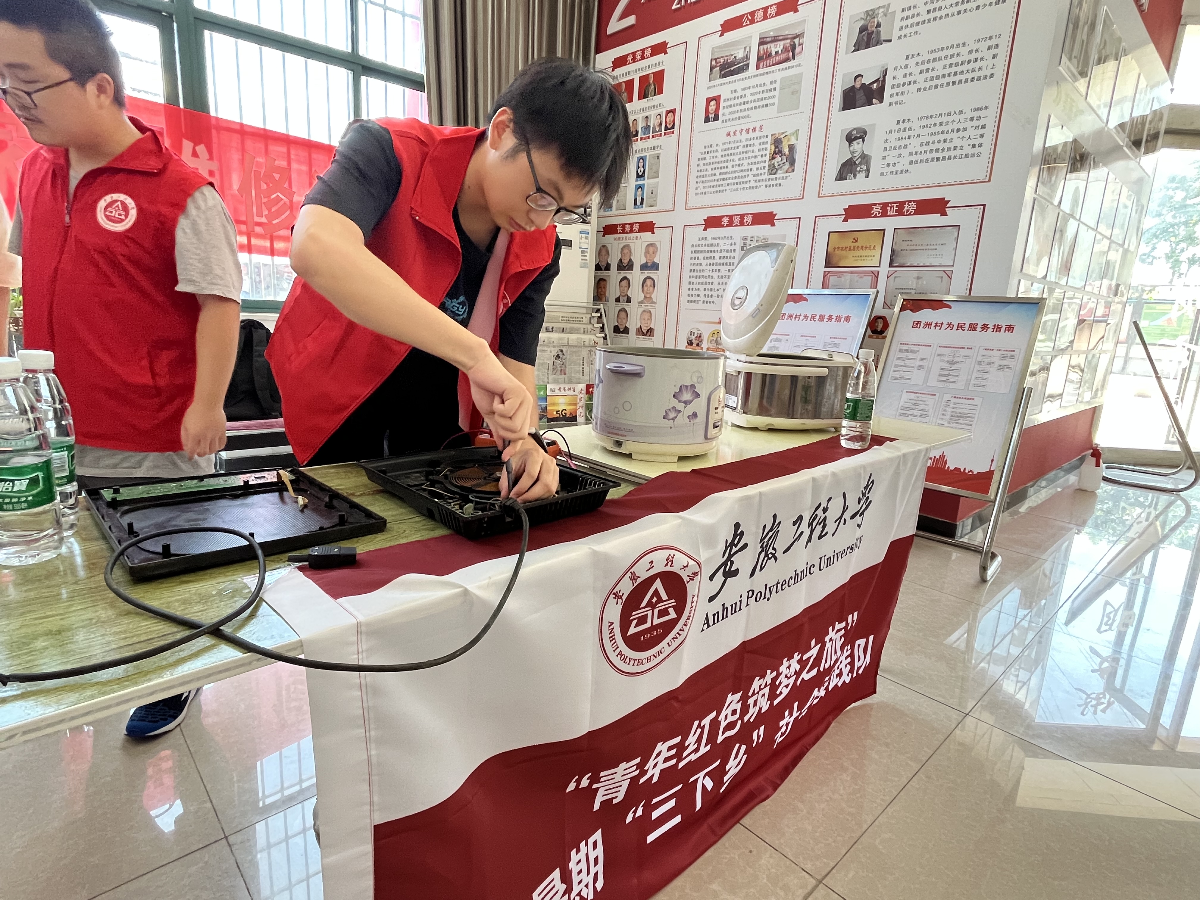 家电义务维修小分队积极开展“我为群众办实事”,在团洲村党群服务中心为村民维修家电。闻讯赶来的群众,带上需要维修的电风扇、热水壶、电饭锅、洗衣机等。活动现场,不论电器大小,同学们都认真细致地帮助村民完成家电维修。村民向同学们表达他们的感谢和赞许。