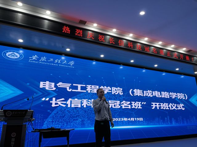长信科技副总裁何晏兵发表了致辞,介绍了集团情况,重点讲述了企业文化,并对冠名班后续建设发展作出了展望。长信科技研发中心经理王超分享了作为研发人员的成长经历,他以亲身经历勉励同学们锐意进取,开拓创新。