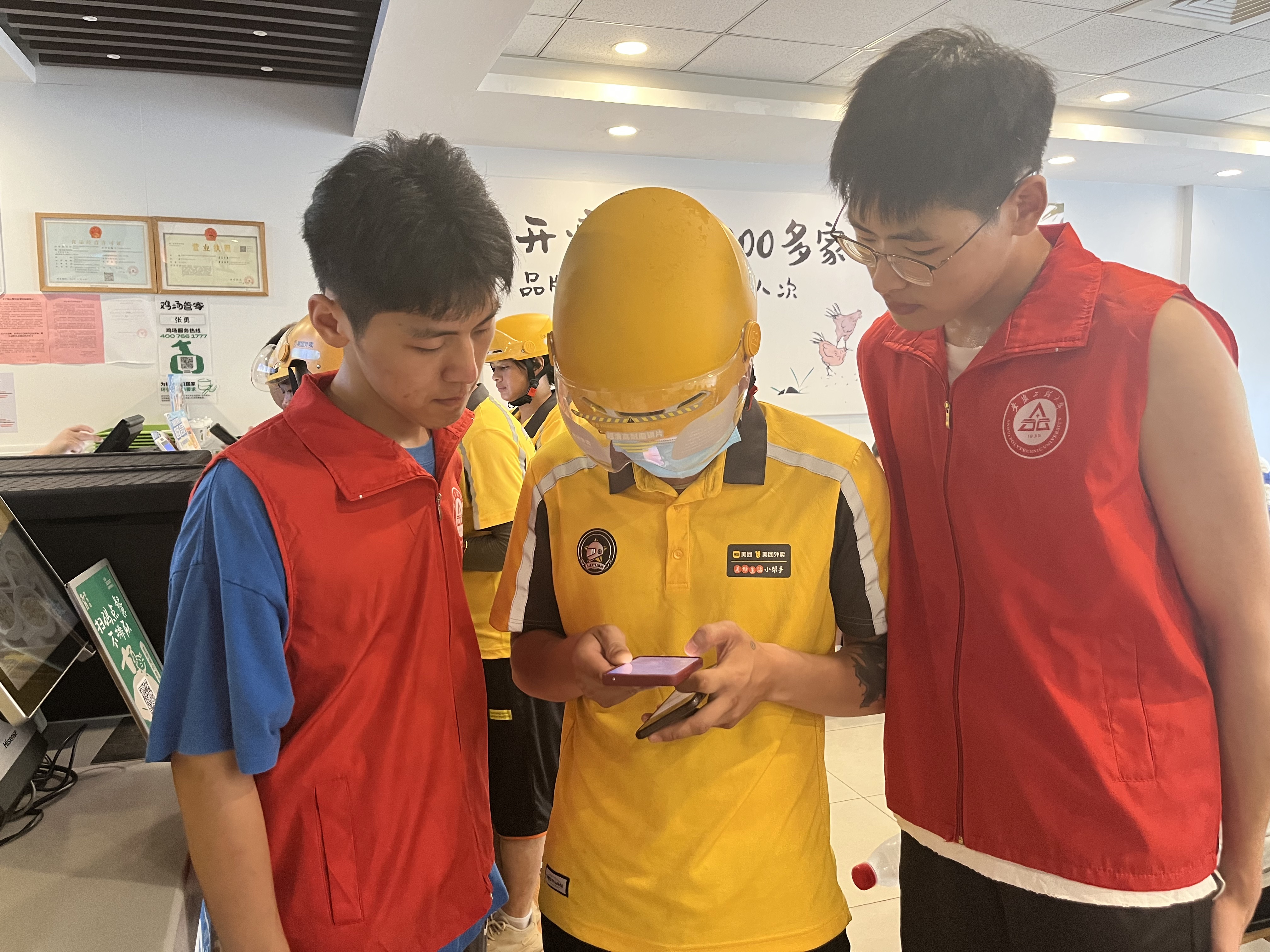 在星悦广场,小分队成员向外卖员们发放了调查问卷主要了解外卖员们的日常收入和工作时长。张师傅从事外卖送餐行业3年多他边填写问卷边和分队成员聊着,他说:“每天接单量约为4050单,上午11时到中午1时,下午5时到7时是配送的高峰时段,在线工作时间达10多个小时。每天辛苦但也很充实,选择这项工作主要是自由,可以方便照顾家庭,也有着不错的经济收入。”自动化20级张铭表示,通过交流,了解到目前很多外卖员在劳动者权益保障上还有很大欠缺,自己回校后,会深入研究这个群体,后期组建志愿服务团队,力所能及地为他们提供帮助。