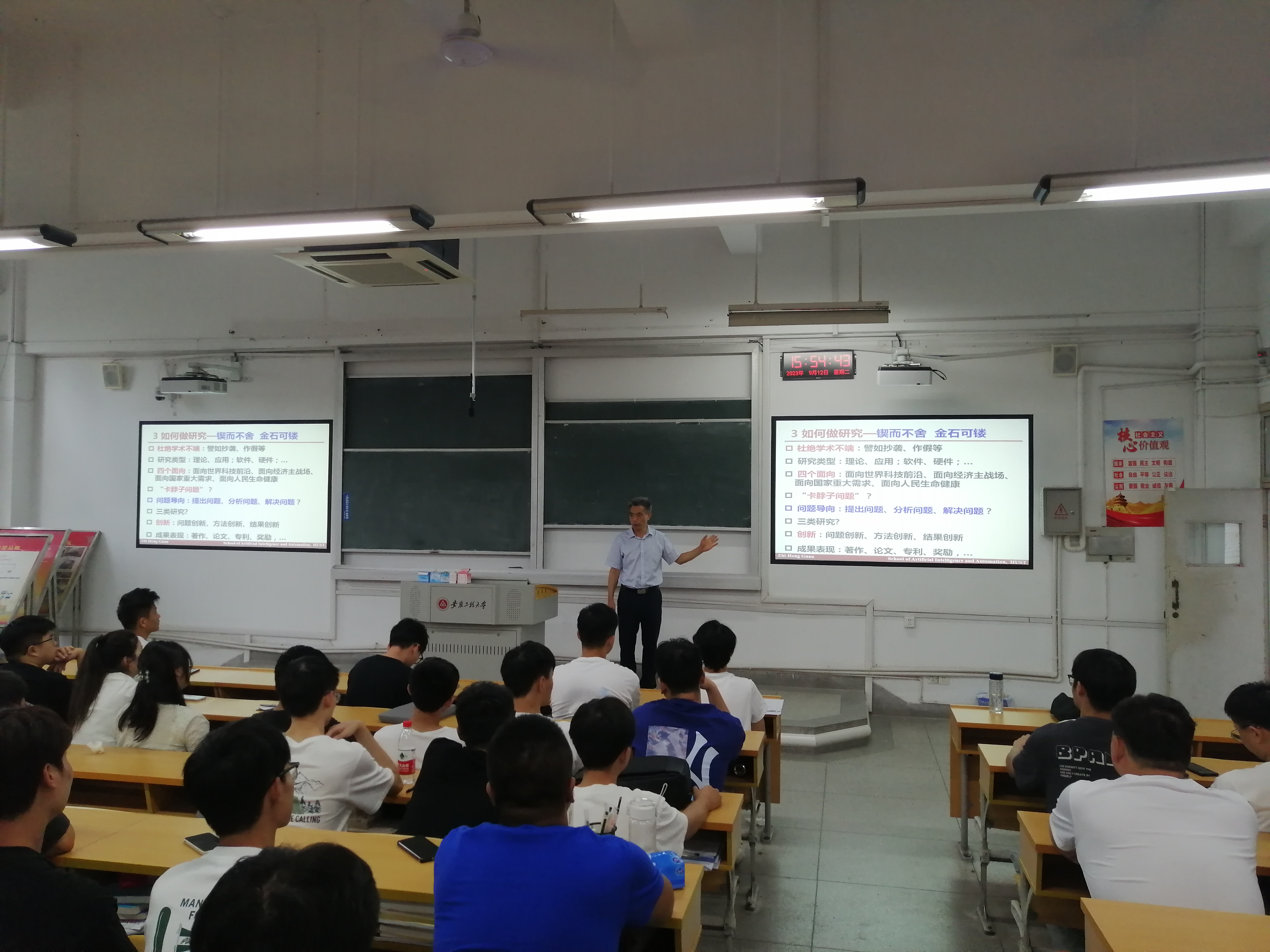 关治洪以“如何珍惜研究生学习机会”为题主讲研究生新生开学第一课。关教授从“为什么读研”、“做怎样的研究生”、“如何做研究”以及“相关研究方向”四个方面勉励新生扎实学习科研,肩负时代使命。关教授特别强调,研究生的学习生活应贯彻“听话、出活”四字,大到听党的话,听国家的话,小到听导师的话,听父母的话;在任务和项目进展方面,也要积极主动推进,转变以往“接受式”学习,逐渐适应“自主式学习”。最后,他祝愿同学们都能在研究生阶段有所收获。
