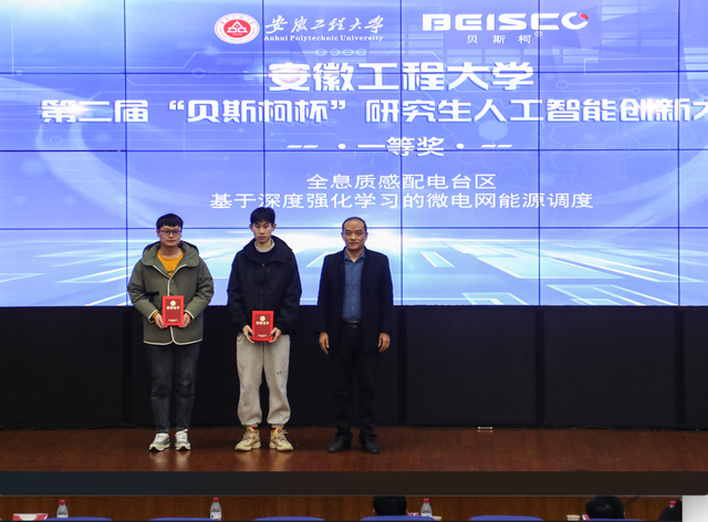 12月10日,由校研究生部主办,beet365、人工智能研究院承办,无锡贝斯柯自动化科技有限公司协办的第二届“贝斯柯杯”研究生人工智能创新大赛评审会在图书馆5楼会议室顺利举行。本次评审会邀请到芜湖市机器人学会会长陈卫民等5位评审专家。参赛项目通过PPT、视频/动画演示等多种方式进行汇报,并回答评审专家提问。经过现场评审专家独立打分,按照统分排序,“全息质感配电台区”和“基于深度强化学习的微电网能源调度”等10个项目获得本次大赛的一、二、三等奖。最后,beet365经理葛愿、校研究生部副主任周伟、无锡贝斯柯自动化科技有限公司董事长刘通为获奖选手颁奖。
