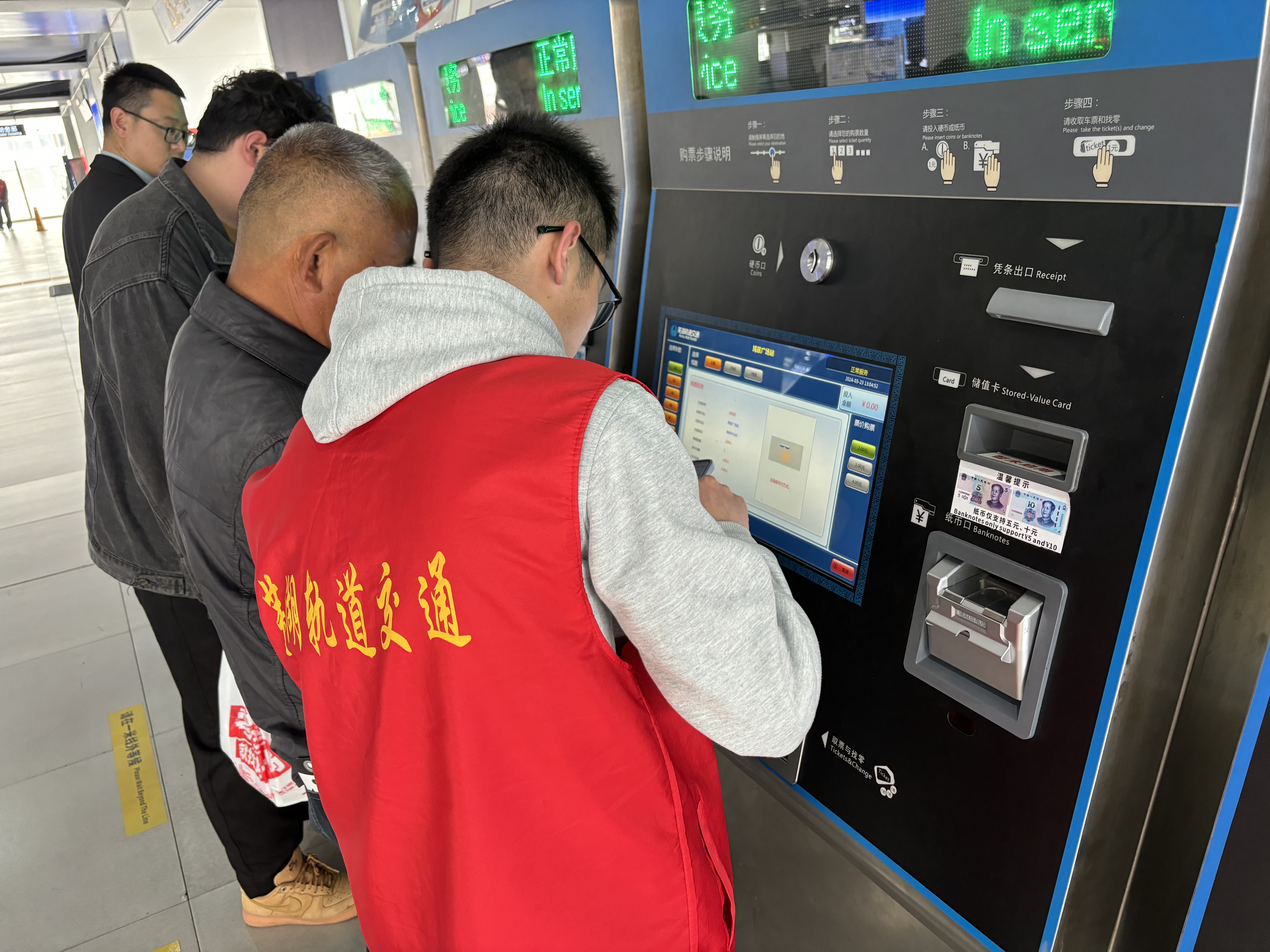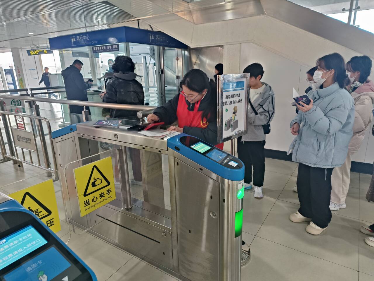 到达所服务的站点后,同学们各归其位,有条不紊地开始一天的志愿服务。遇到在售票处、路线图处踌躇的市民和旅客,总是主动询问是否遇到难题;碰见在闸机口、安检处提着大件行李的市民的旅客,也总会大步上前帮忙搬运……说话礼貌、面带微笑,这些穿着红色小马甲的同学,在熙熙攘攘的人群中织出一道亮丽的风景线。