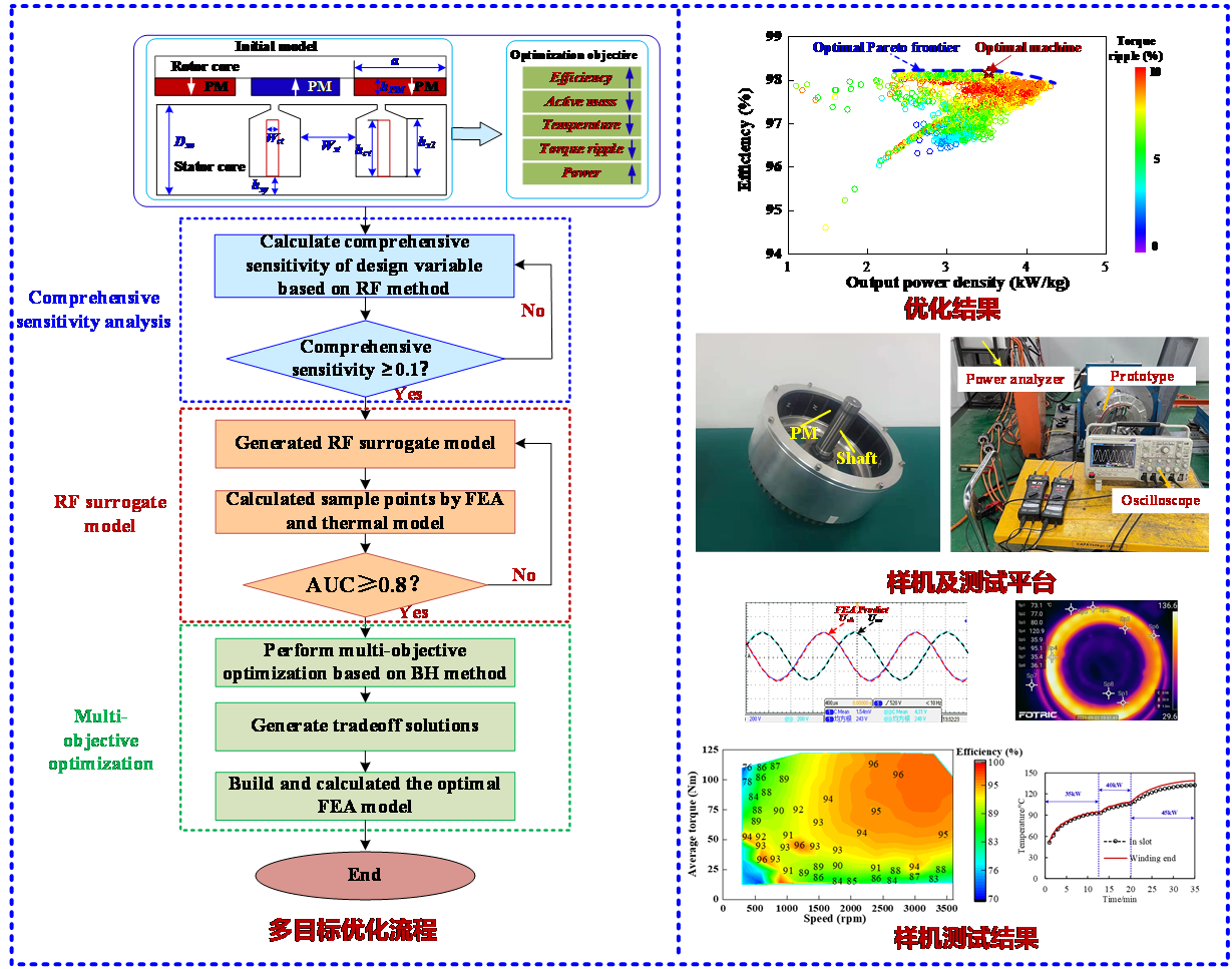 特种车辆对驱动和发电系统的功率密度提出了更严苛的需求,针对特种车辆增程发电系统,研究成果创新地提出了一种集成发动机飞轮壳的外转子永磁起动发电机拓扑结构和高效冷却方法,在此基础上,将随机森林算法和黑洞算法相结合,考虑温度和电磁特性,对外转子永磁起动发电机进行多目标优化;结果表明,与传统增程发电系统相比,在相同条件下电流密度提高了45.1%,效率提高了3.2%。最后,面向3.0T特种运输车辆的增程发电系统,研制了一台25kW的工程样机,最高效率达95%,功率密度达1.53kW/kg。
