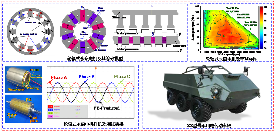 同时,面向特种车辆驱动系统,研究成果提出了一种双边开槽型轮辐式永磁电机拓扑结构,研究了该拓扑结构的双边磁场调制效应,基于Maxwell应力张量法,阐明了其谐波转矩的产生理论,揭示了该类电机具有多重工作谐波的机理,并对转子参数进行优化设计。最后,试制了一台12000r/min,90kW的工程样机,并进行试验验证。该研究成果成功应用于“XX”电传动车辆,实现了特种车辆动力性能的显著提升。