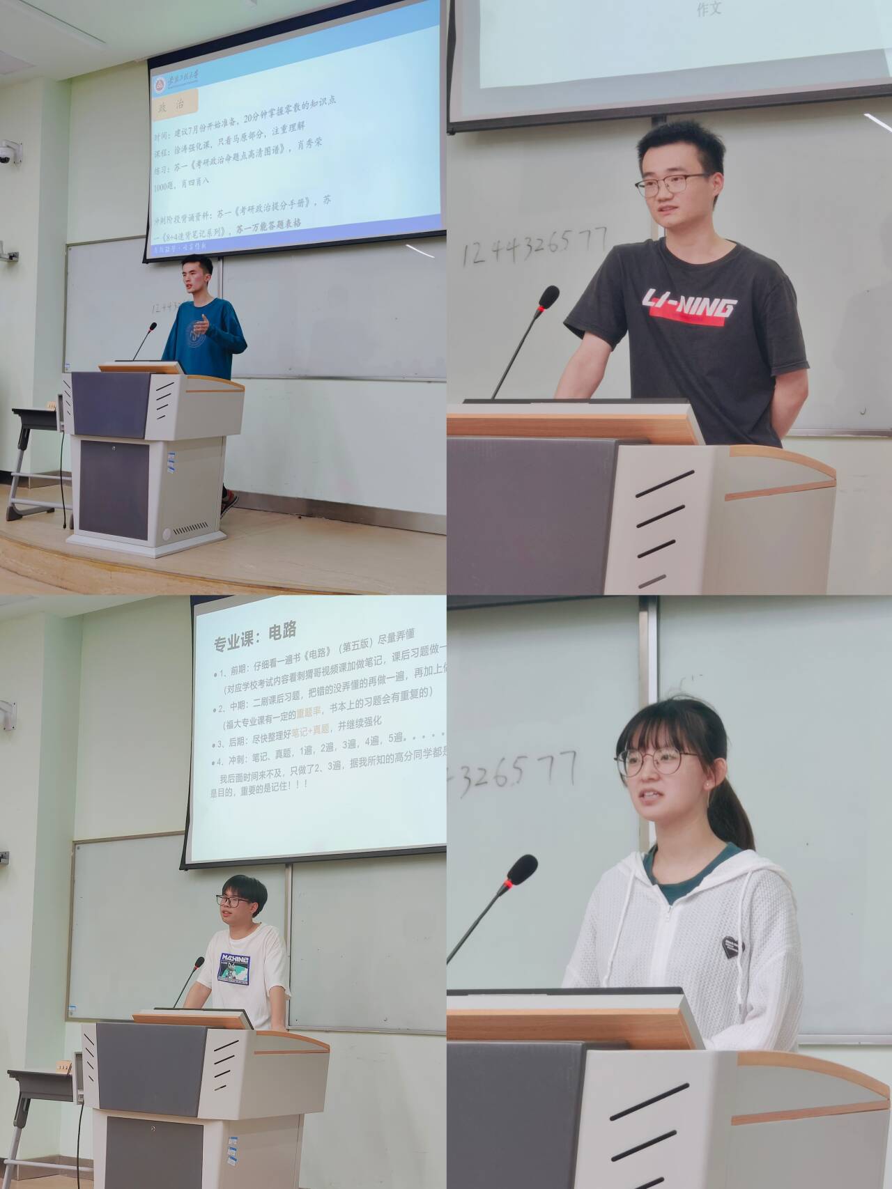 活动伊始,邱意敏同志介绍了2024年电子科技协会和智能控制协会成员在考研方面的整体情况。随后,考取北京理工大学的司嘉宜、山东大学的黄紫辰、东北林业大学的代鑫、福州大学的杨伟龙几位同学依次上台,结合自身考研经验,深入浅出地分享了备考期间如何科学安排各科复习时间、如何在紧凑的时间内最大化地掌握专业知识、以及怎样准确把握学科考试的重点和难点等宝贵经验。在提问交流环节支部成员们积极发言,就学习、学科竞赛、考研备考等方面遇到的疑惑进行了提问。学长学姐们耐心倾听,并逐一给出了详尽的解答和建议。同时,学长学姐们还留下了自己的联系方式,表示欢迎同学们在后续学习过程中随时提问,共同解决学习难题。