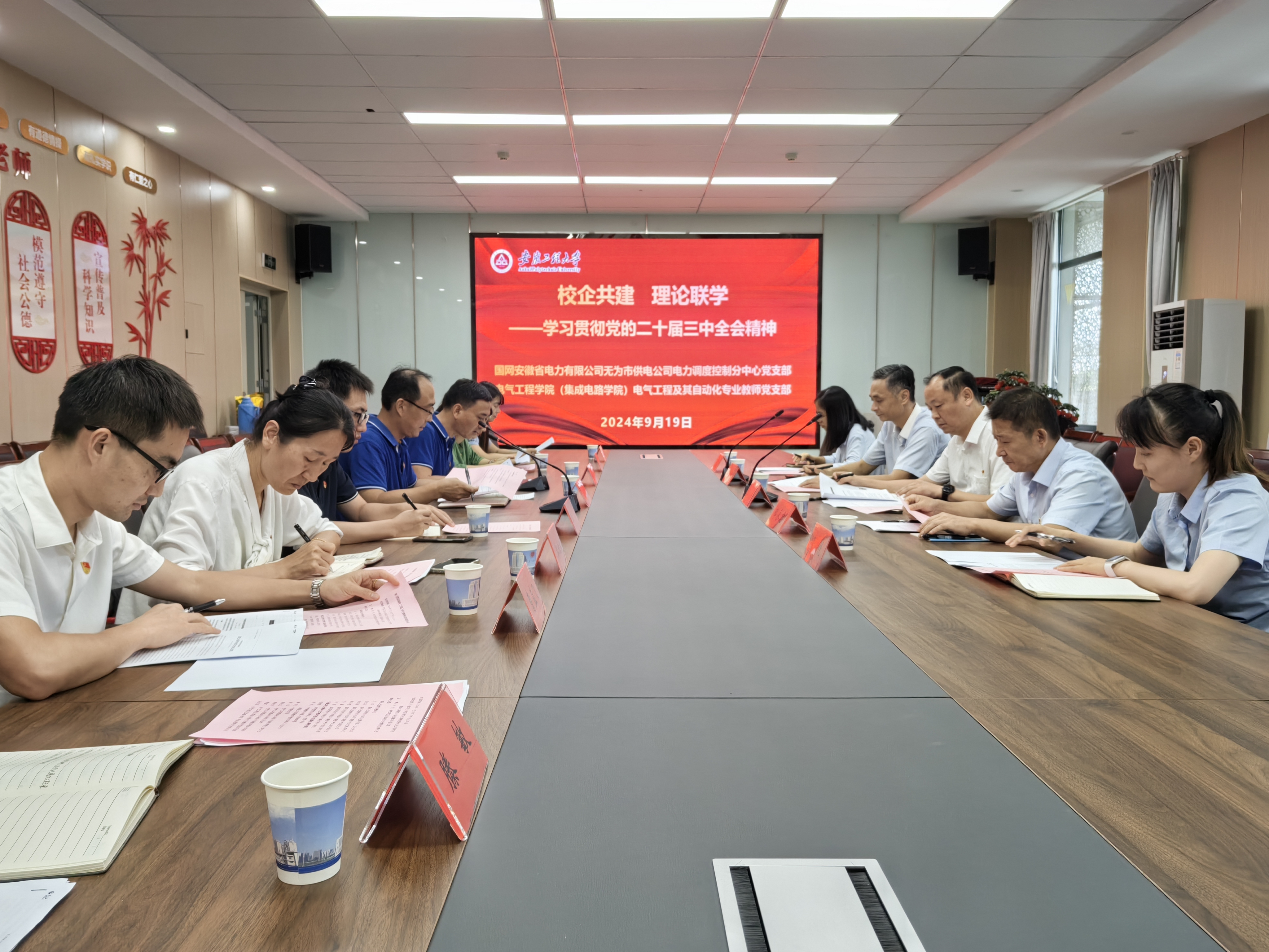 9月19日下午,beet365迎来了一场别具意义的校企党建联学活动。国网安徽省电力有限公司无为市供电公司纪委书记、工会主席王东率电力调度控制分中心党支部一行,与公司电气工程及其自动化专业教师党支部共同开展了以“校企共建 理论联学——学习贯彻党的二十届三中全会精神”为主题的支部共建联学活动。公司党委副书记、纪委书记迟传德,公司党委委员、经理助理李炜出席活动,共建党支部全体党员、公司专职组织员共同参加联学。会议由电气工程系教师党支部书记徐杰主持。