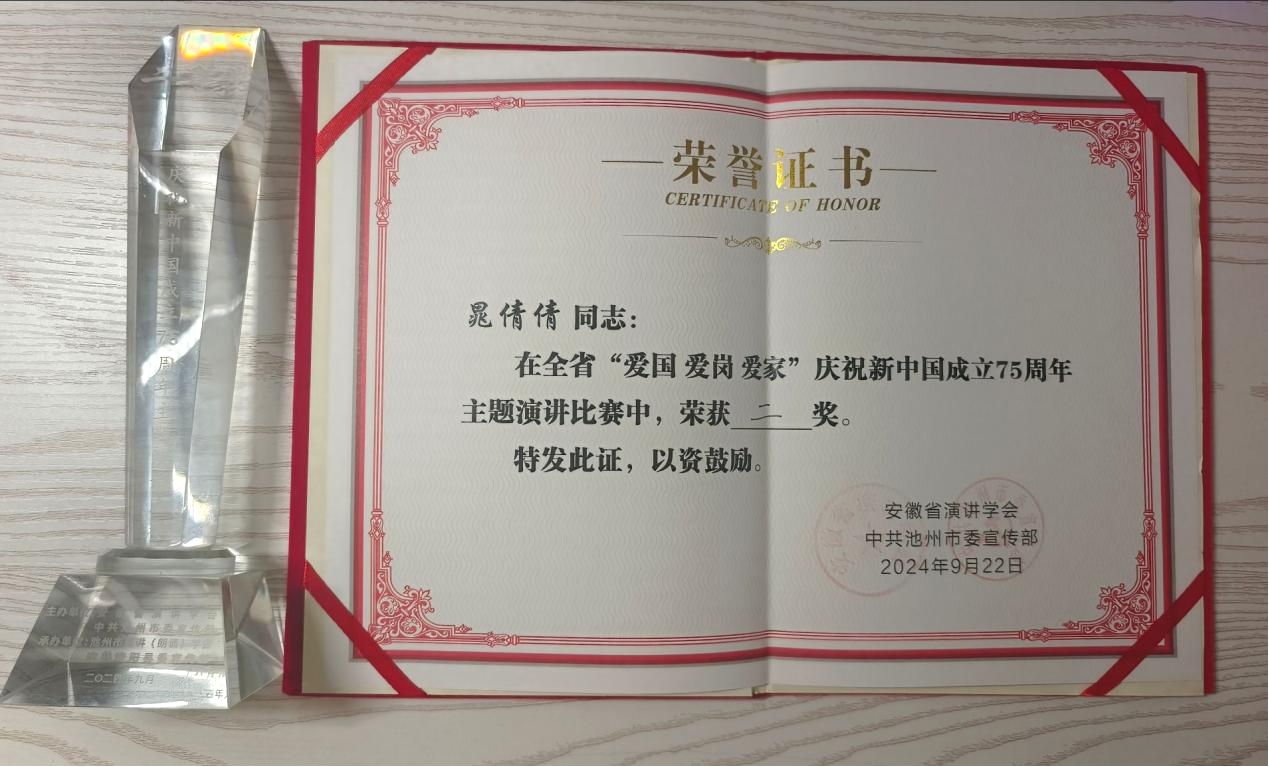 近日,由安徽省演讲学会和中共池州市委宣传部联合主办的全省“爱国 爱岗 爱家”主题演讲大赛在池州成功举办。beet365电子233晁倩倩同学荣获省二等奖。