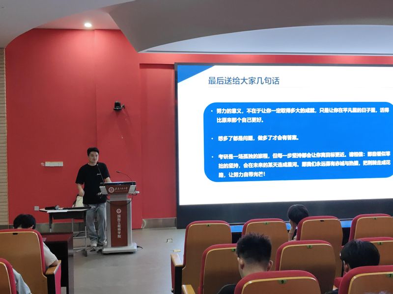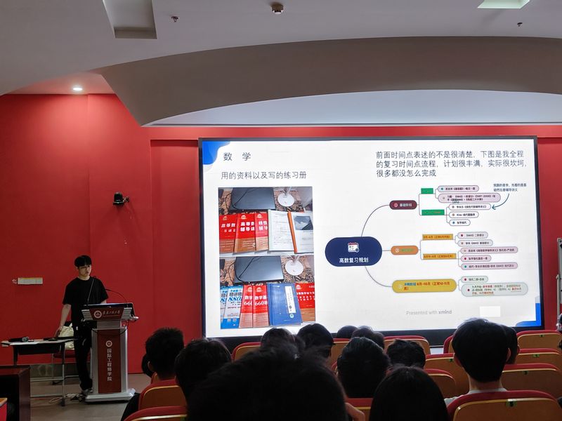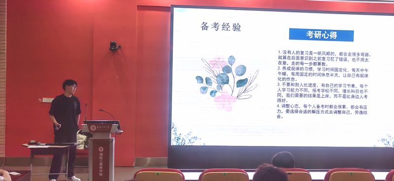 分享会伊始,上岸南京理工大学的张伟豪同学率先登场,分享了自己的备考时间规划和各科目复习策略。他详细介绍了每个阶段的学习重点和目标。在专业课复习方面,张同学强调要深入研究教材,构建完整的知识体系,同时结合历年真题把握考点和命题规律。随后,上岸东华大学的林佳钰同学针对英语复习提出了一些建议,比如每天坚持背诵一定数量的单词,并通过做真题阅读来提高阅读理解能力和语感。她还分享了自己整理笔记和错题集的方法,帮助同学们提高学习效率。上岸安徽大学的王中凯同学们从复习资料的选择到复试的注意事项,从学习时间的分配到备考中的心态调整,都毫无保留地分享了自己的经验和建议。