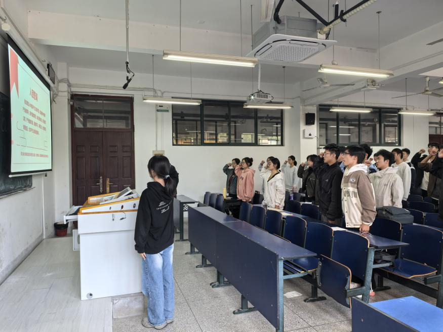 在宣誓环节,自动化252赵欣然同学作为领誓人,带领全体学员举起右拳,重温入团誓词。“我志愿加入中国共产主义青年团,坚决拥护中国共产党的领导……”铿锵有力的誓言回荡在教室中,彰显着学员们不忘初心、砥砺前行的坚定决心。