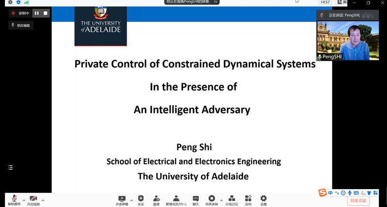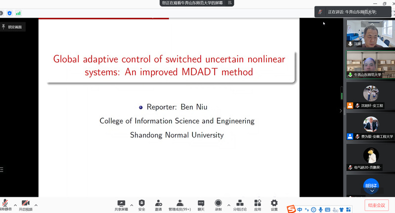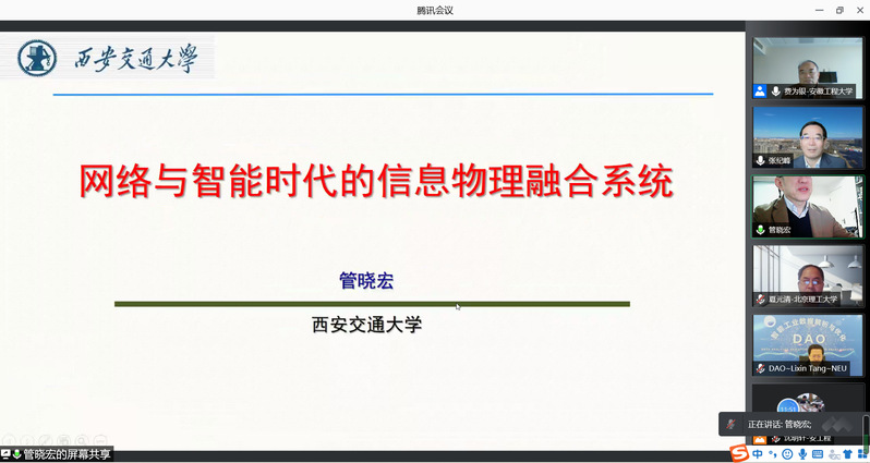 本次线上学术研讨会自11日早上8点50至晚上9点,共有14位报告人作了精彩报告,带来了国内外最新的研究成果。11日上午的报告由中国科公司数学与系统科学研究院系统所张纪峰研究员和华中科技大学关治洪教授主持。中国科公司院士、西安交通大学管晓宏教授作了《网络与智能时代的信息物理融合系统》的报告,介绍了智能时代的大环境下,信息物理融合系统在制造、能源、交通及航空航天等领域的重大应用;中国工程院院士、东北大学副董事长唐立新教授作了题为《Data analytics and optimization for smart industry》的报告,详细介绍了钢铁生产行业中生产、能源、数据以及物流系统模型和优化方法;山东大学刘允刚教授以《Adaptive finite-time stabilization with arbitrarily prescribed settling-time》为题介绍了不确定非线性系统自适应定时控制方法;华东理工大学牛玉刚教授则通过《Markov跳变系统/切换系统的同步和异步控制》的报告介绍了Markov跳变系统和切换系统等多模态系统控制设计与应用中的同步和异步问题。