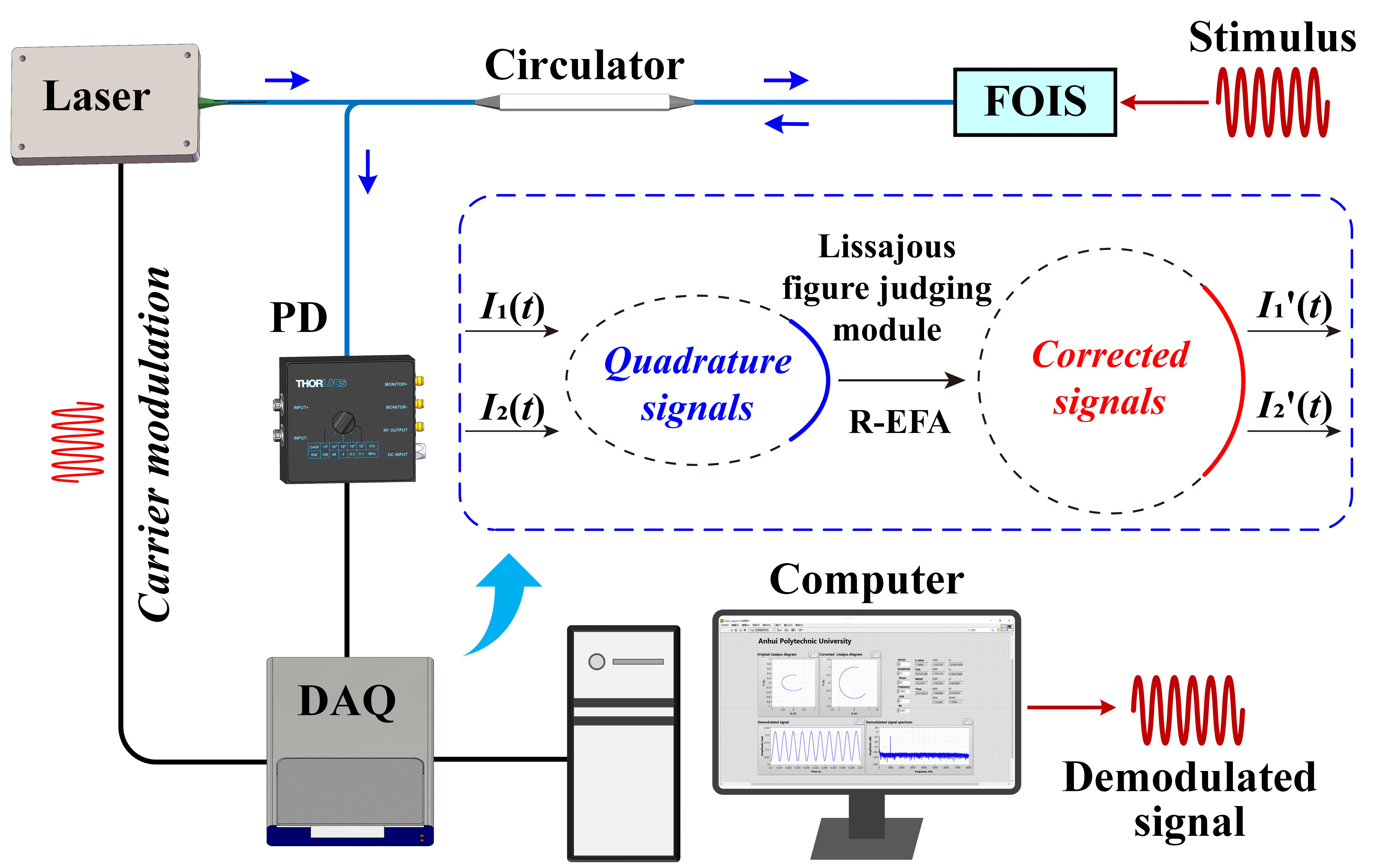 干涉型光纤传感器(FOIS)在水声监听、深地资源探测、惯性导航和动力学灾害预警等领域有着广泛应用,作为核心技术的相位生成载波(PGC)解调技术一直被非线性失真难题困扰着的。针对该难题,光纤传感创新研究小组提出了一种高健壮性PGC解调方案,创新性地将自主开发的李萨如图弧长判断模块和计算机视觉领域的高性能椭圆拟合算法应用于光电信号处理。该方案不仅消除了非线性因素引起的谐波失真,还克服了椭圆拟合算法在小信号下无法正常工作的问题,大幅提升了相位解调器的性能。