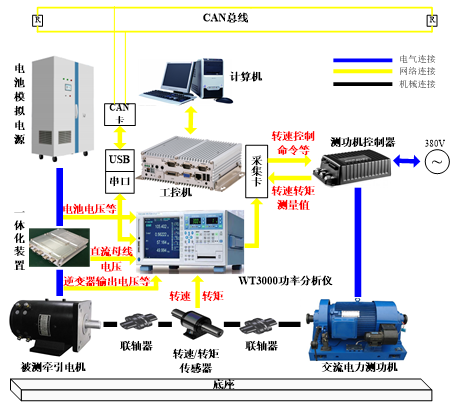 (1)平台一:新能源汽车电驱动系统测试平台,新能源汽车电驱动系统测试平台主要由电池模拟电源、功率分析仪、交流电力测功机、电机控制器、工控机、上位机、被测永磁同步电机、以及扭矩/转速传感器等构成,系统采用CAN总线集成。测试参数包括:测功机转速、扭矩、功率,电动机输入电压、电流,控制器输出电压、电流有效值,控制器输出有功功率,控制器输出频率、功率因数、效率等。平台上可进行电驱动系统速度特性试验、负荷特性试验、控制器输出电特性试验。