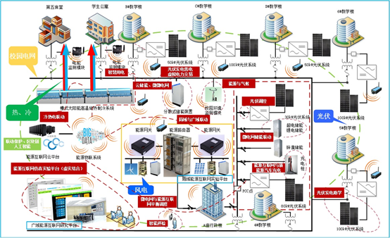 (2)平台二:能源互联网平台,在光伏微电网系统基础上增加了风力发电单元、冷热电联供系统、分散式储能装置、能源网关、能源路由器等模块,研发了多能互补协同优化控制、分散式储能控制、广域联动保护策略、虚拟化云端管控等技术,建有能源互联网智慧服务云平台(/index.html