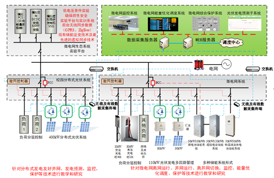 (1)平台一:光伏微电网系统,由光伏发电单元、逆变器、混合储能单元、充电桩、微电网控制器、综合保护装置、监控与能量管理系统等组成,研发了基于自抗扰控制的PCS充放电控制、考虑时序配合的PCS离/并网运行平滑切换、基于分层协同的PCS多模式运行构架、基于硬件软件解耦的分层保护、基于自律分散分层解耦的监控系统设计、基于虚拟同步发电机控制的微电网电能质量治理等技术。
