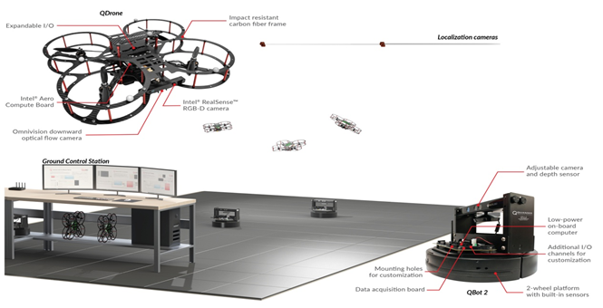 (1)平台一:移动机器人、无人机控制平台,系统由实时控制软件和多智能体任务开发体系、地面控制站、无人飞行器、无人地面机器人、照相机定位系统等几部分组成,可完成无人工具的动态建模和控制研究、运动规划、避障控制、机器视觉、机器学习、多信息融合、地空协同控制、无人工具自主控制等、视觉SLAM、传感器网络、群控策略等实验任务。